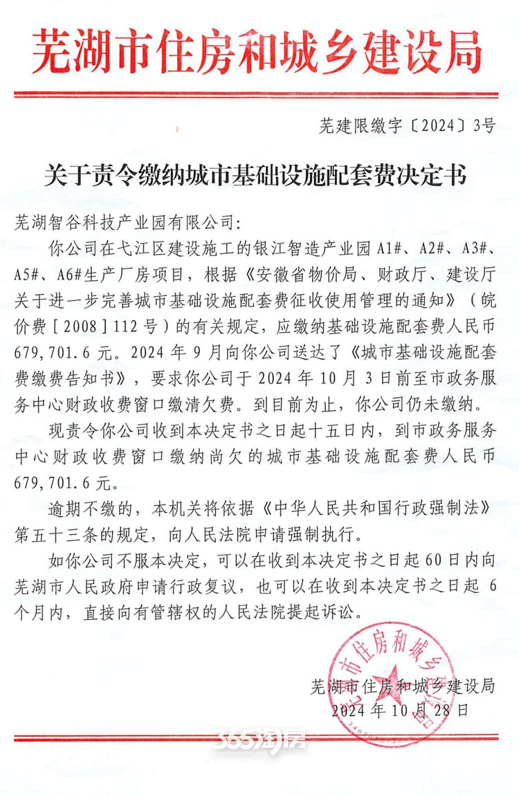 近日,蕪湖市相關部門正式發布《關于蕪湖智谷科技產業園有限公司的行政強制執行催告書(公告送達)》。催告書中顯示:蕪湖智谷科技產業園有限公司在弋江區建設施工的銀江智造產業園A1#、A2#吧有你春暖花開、A3#、A5#、A6#生產廠房項目,根據有關規定應繳納基礎設施配套費人民幣679,701.6元,目前未收到相關費用吧有你春暖花開,逾期不繳相關部門會向人民法院申請強制執行BEAT365體育亞洲版。