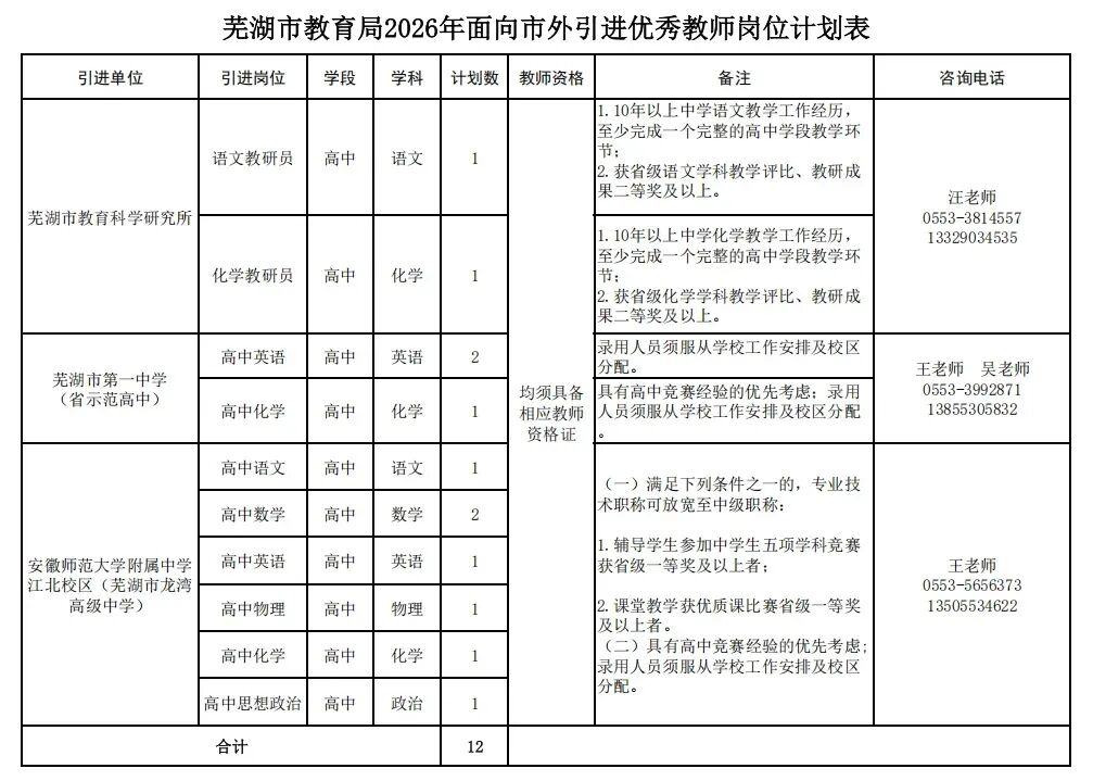 為加強教師隊伍建設,推動教育高質量發展,蕪湖市教育局近日發布公告,正式啟動2026年面向蕪湖市外(不含蕪湖市本級及所轄縣市區)引進12名優秀在編在崗教師工作。 此次引進要求報名者年齡原則上不超過45週歲,具有本科及以上學歷和副高級及以上職稱,並獲得地市級“骨幹教師”相當層次及以上榮譽。特別優秀者條件可適當放寬。
